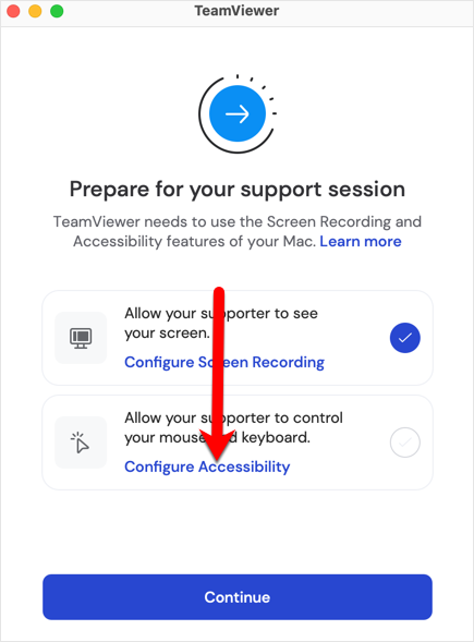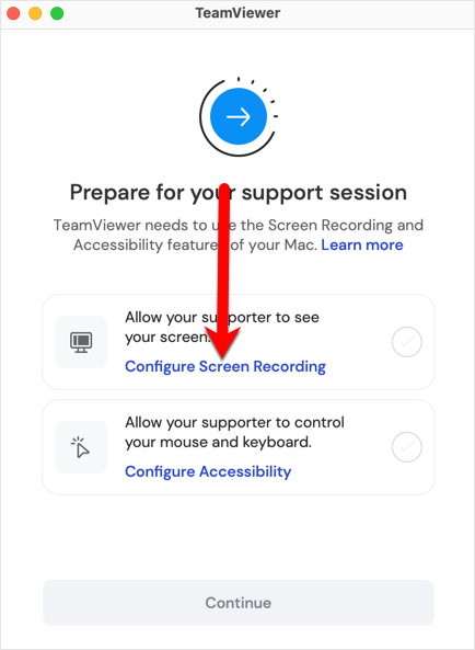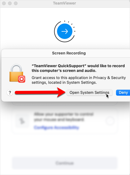 7. If you are running macOS Mojave (10.14) or later, TeamViewer requires your permission to use screen recording, mouse, and keyboard. Click on Configure Screen Recording → Open System Settings (“Open System Preferences” on older Macs).
