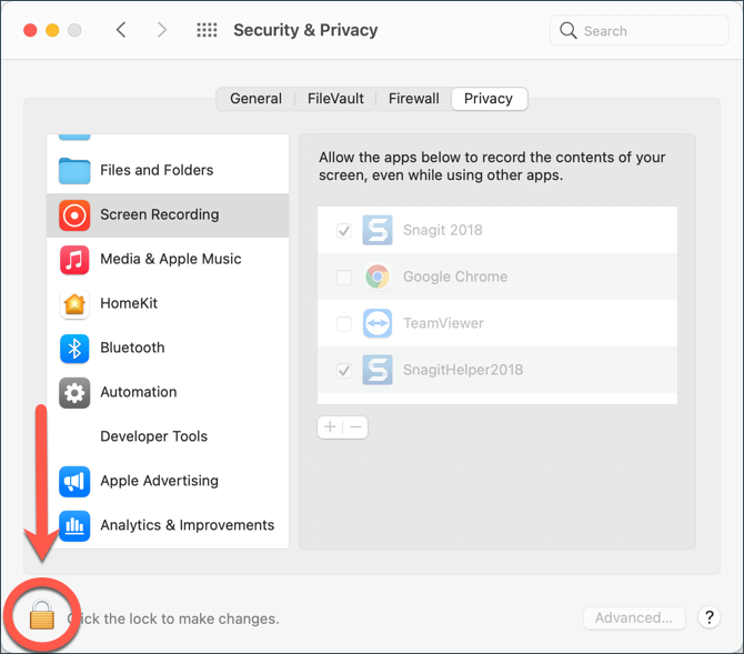 ⓘ Note: On macOS Mojave (10.14), Catalina (10.15), Big Sur (11) and Monterey (12) you must first click the padlock in the bottom left corner, enter your administrator name and password, and then put a checkmark next to TeamViewer.