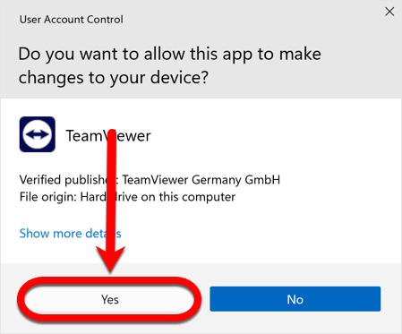 4. A dialog box appears, asking for permission. Go ahead and give the TeamViewer app permission by clicking Yes.